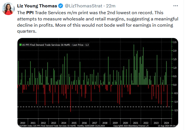 PPI came in lower than expected across the board. The headline monthly figure rose 0.1%, a tenth below expectations. Core PPI was 0.0%, which brought down the year-over-year core PPI from 3% to 2.4%. Assuming today’s CPI print is tame, the case for a September rate cut strengthens. The graph below shows that the PPI would likely have been slightly negative without energy prices. The Tweet of the day shows corporations are having a much more difficult time passing on inflation to their customers. Ergo, profit margins, and, ultimately, earnings are at risk for some companies.