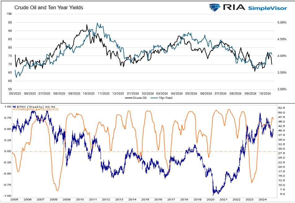 It’s no secret that bond yields are heavily impacted by inflation and inflation expectations. Moreover, oil prices have a high correlation with inflation. So, to answer why bond yields are rising recently, it’s helpful to check the oil price. Since May 2023, as we share below, crude oil prices and ten-year UST yields have been tracking each other closely. But, you will see that oil tends to lead bond yields when the trends change. The lower graph shows the running 1-year correlation of oil and bond yields on a long-term basis. While there is a long-term positive relationship, it does vary significantly over time.