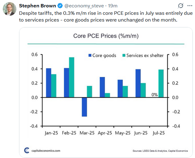 PCE prices came in as expected on Friday. The graph below shows that PCE prices, both headline and core, have remained relatively flat over the last year. The impact of tariffs has yet to have an impact on inflation data. Furthermore, check out the Tweet of the Day. It shows that PCE goods prices, which are most susceptible to tariffs, were flat for the month.