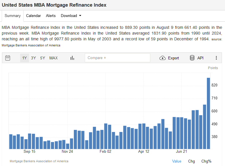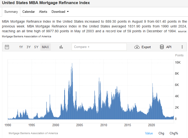 With mortgage rates approaching 6.25%, down almost 2% from last year’s high, some recent mortgagees are incentivized to refinance their mortgages. The first chart below shows that the MBA mortgage refinance index has nearly tripled over the last year. While this may appear significant, a glance at the longer-term graph shows that the index is still far from average. In fact, it is still below the troughs of the prior 25 years. Because the number of homes sold over the last few years has been below average, the number of potential refinancing will also be below average. This means that when the Fed does cut rates, its effect on the mortgage refinancing market will be much less than they are accustomed to.