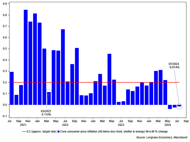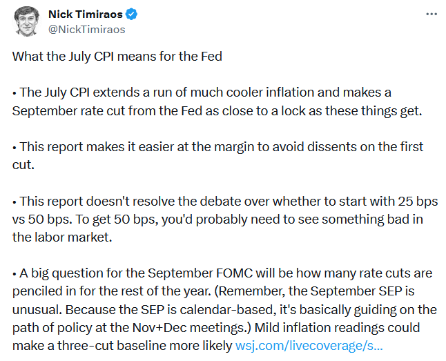 Unlike yesterday’s cooler-than-expected PPI report, CPI was right on the screws. As expected, CPI and CPI core rose 0.2% for the month. On a year-over-year basis, they run 2.9% and 3.2%, respectively. The data pretty much locked the Fed into a 25bps ease at the September meeting, as Nick Timiraos states in today’s Tweet of the Day. However, despite the as-expected CPI print, the Fed may soon worry about deflation if you consider CPI without shelter prices. Sound crazy?