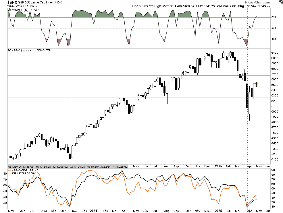 While the market has recovered the losses following the tariff announcement, it is still struggling within a broad trading range from the summer of last year. Upside remains limited to 5700, and with the markets back to short-term overbought (as noted above), I would be reticent of chasing markets too much further. As we have discussed often, if the sell-off from the February peak was emotionally distressing, or you suffered more severe losses than the market itself, you were carrying too much risk. Use the rally to reduce risk, raise cash, and rebalance exposures. If the market continues to rally in the near term, continue that process.