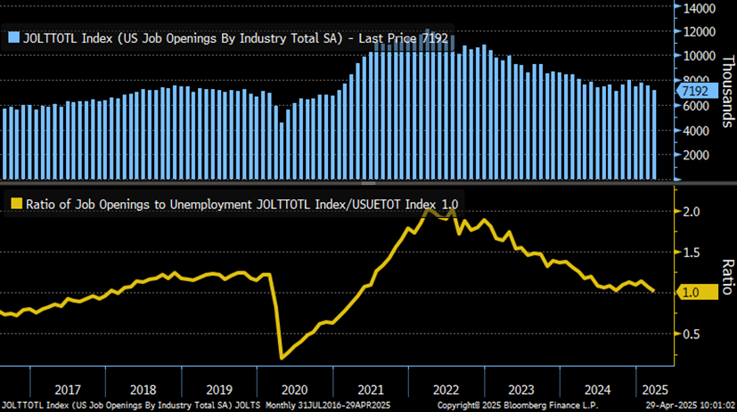 According to the BLS JOLTS report, the number of job openings fell to 7.192 million, down from 7.48 million. The ratio of job openings to those unemployed fell to 1.0, matching its four-year low and below the levels preceding the pandemic. Despite fewer companies looking for employees, layoffs declined from 1.79 million to 1.56 million.