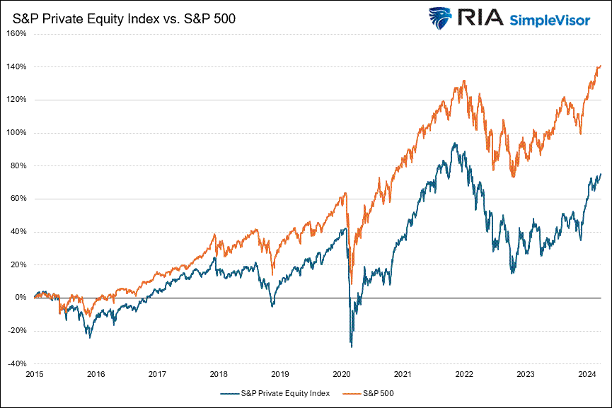 The graph below highlights that the S&P Private Equity Index has grossly underperformed the S&P 500 since 2015. However, the index only represents listed private equity companies meeting specific requirements.